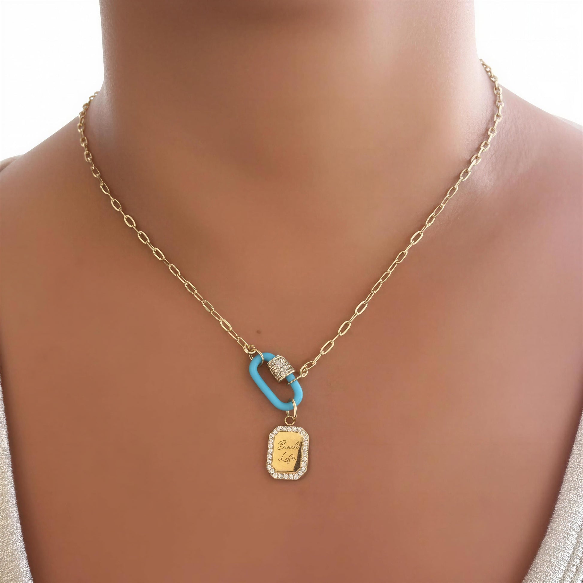 A modern paperclip chain necklace designed with a front-opening gold lock accented with cubic zirconia for a refined touch. Effortless and versatile, this piece blends everyday style with subtle luxury. Finished with a delicate “beach life” pendant framed with shimmering cubic zirconia, it captures a relaxed, sun-kissed aesthetic. Perfect for layering or wearing on its own, this necklace brings a touch of coastal charm to any look. Handcrafted jewelry. "I design Meaningful Jewelry for the Strong, Independent and Confident woman who is not afraid to shine like the star she is”Couldn't load pickup availability