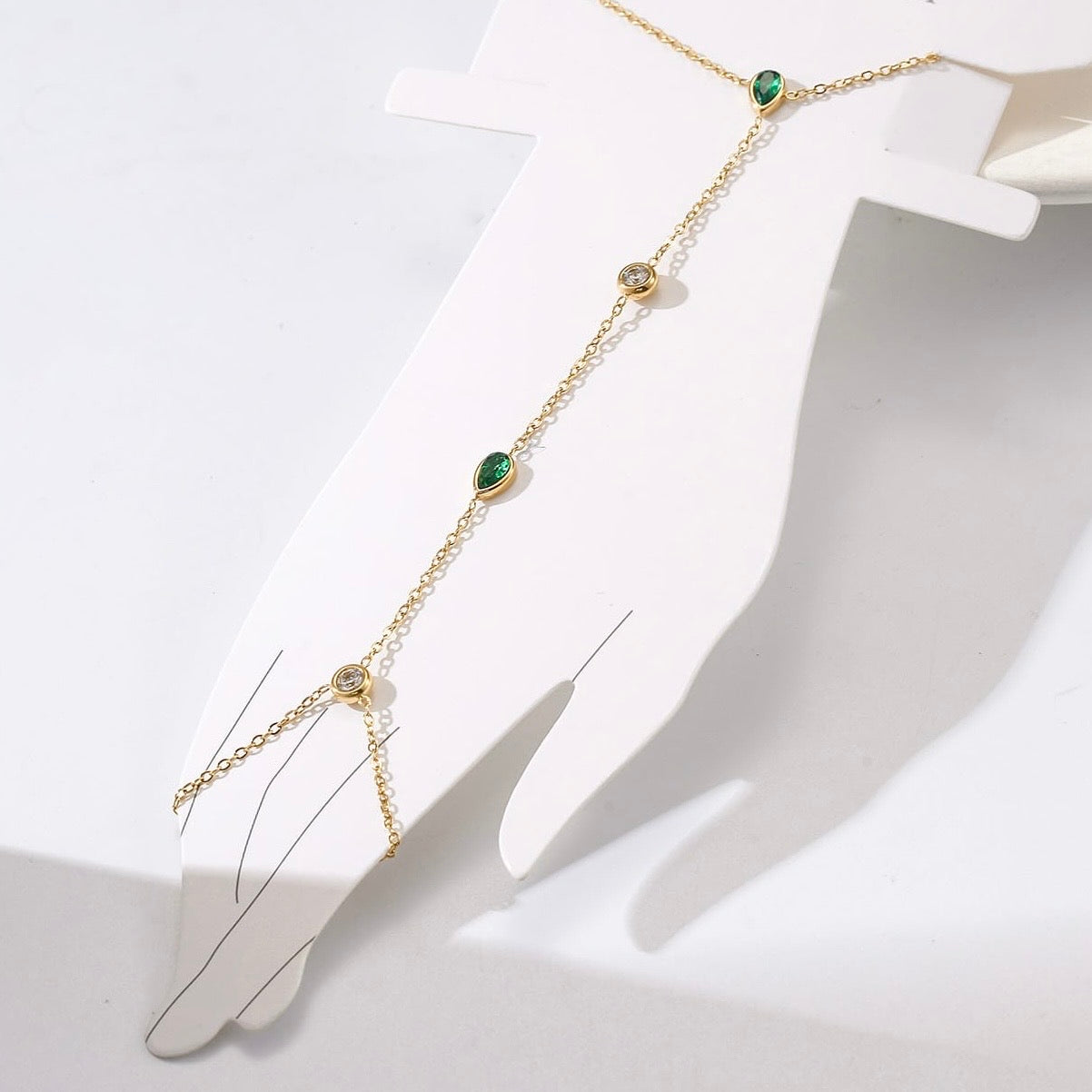 Inspired by moonlight and nature, the Luna Verde Hand Chain features shimmering green and clear stones set on PVD-plated stainless steel. Waterproof and tarnish-resistant, it’s made for effortless, everyday elegance with a modern boho touch. Whether styled solo or layered with your favorite rings and bracelets, Luna Verde adds a subtle hint of sophistication and grounded beauty to any look. Handcrafted jewelry. "I design Meaningful Jewelry for the Strong, Independent and Confident woman who is not afraid to shine like the star she is”Couldn't load pickup availability