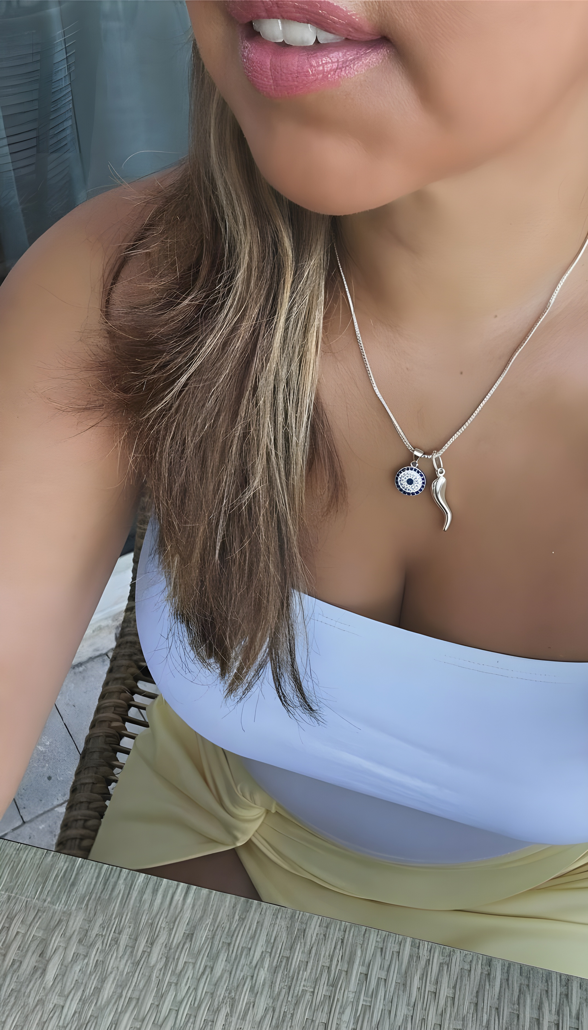 A perfect blend of elegance and meaning. Crafted from .925 sterling silver, this necklace features a striking Italian horn and eye charm. The Italian horn is a symbol of protection and strength, while the eye represents spiritual awareness and vigilance. Together, they create a powerful piece that offers both style and positive energy, keeping you empowered and safeguarded. Handcrafted jewelry. "I design Meaningful Jewelry for the Strong, Independent and Confident woman who is not afraid to shine like the star she is”Couldn't load pickup availability