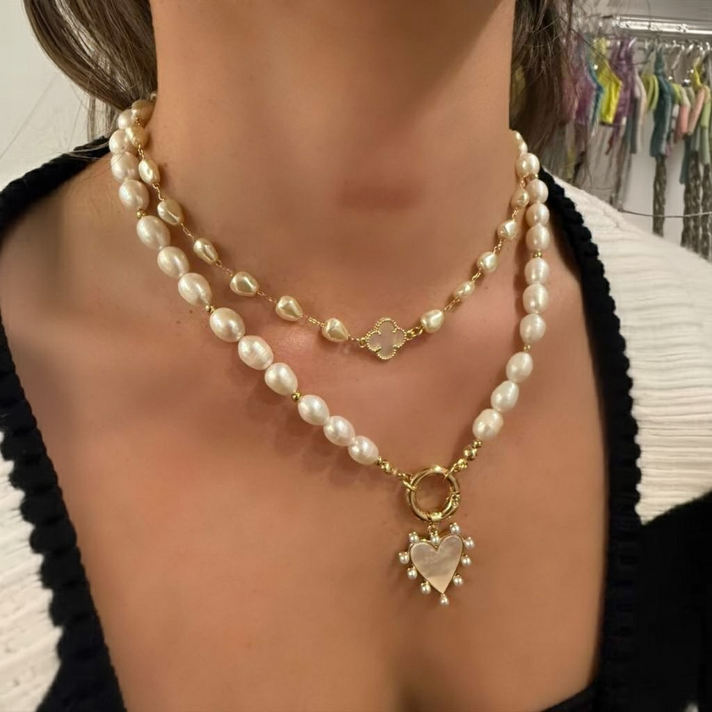 The soft luster of each pearl brings classic elegance with a modern touch. Designed with a round gold front-opening lock, this piece allows you to customize your look by adding or switching charms. It is finished with a luminous mother of pearl heart, framed with tiny pearls for an extra layer of delicate detail. Romantic, sophisticated, and effortlessly elegant, this necklace is perfect for special occasions or elevating your everyday style. Handcrafted jewelry. "I design Meaningful Jewelry for the Strong, Independent and Confident woman who is not afraid to shine like the star she is”Couldn't load pickup availability